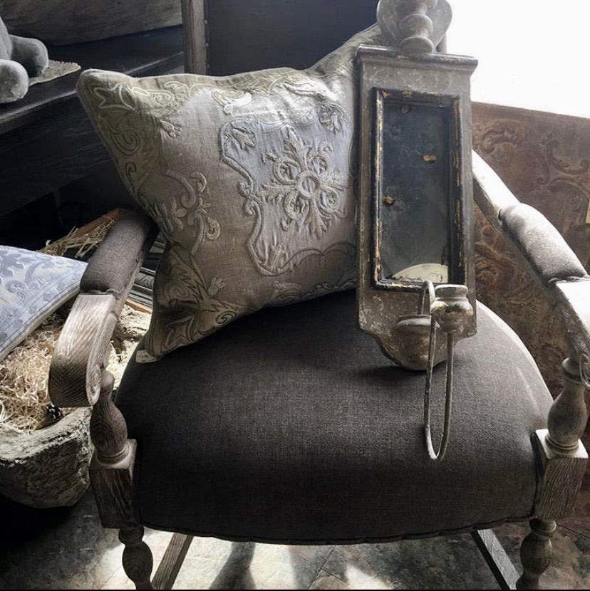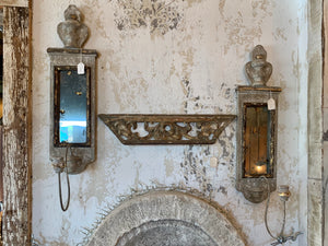 Hand carved mirror candle sconce. Made of wood, with rich gray and gold accents.